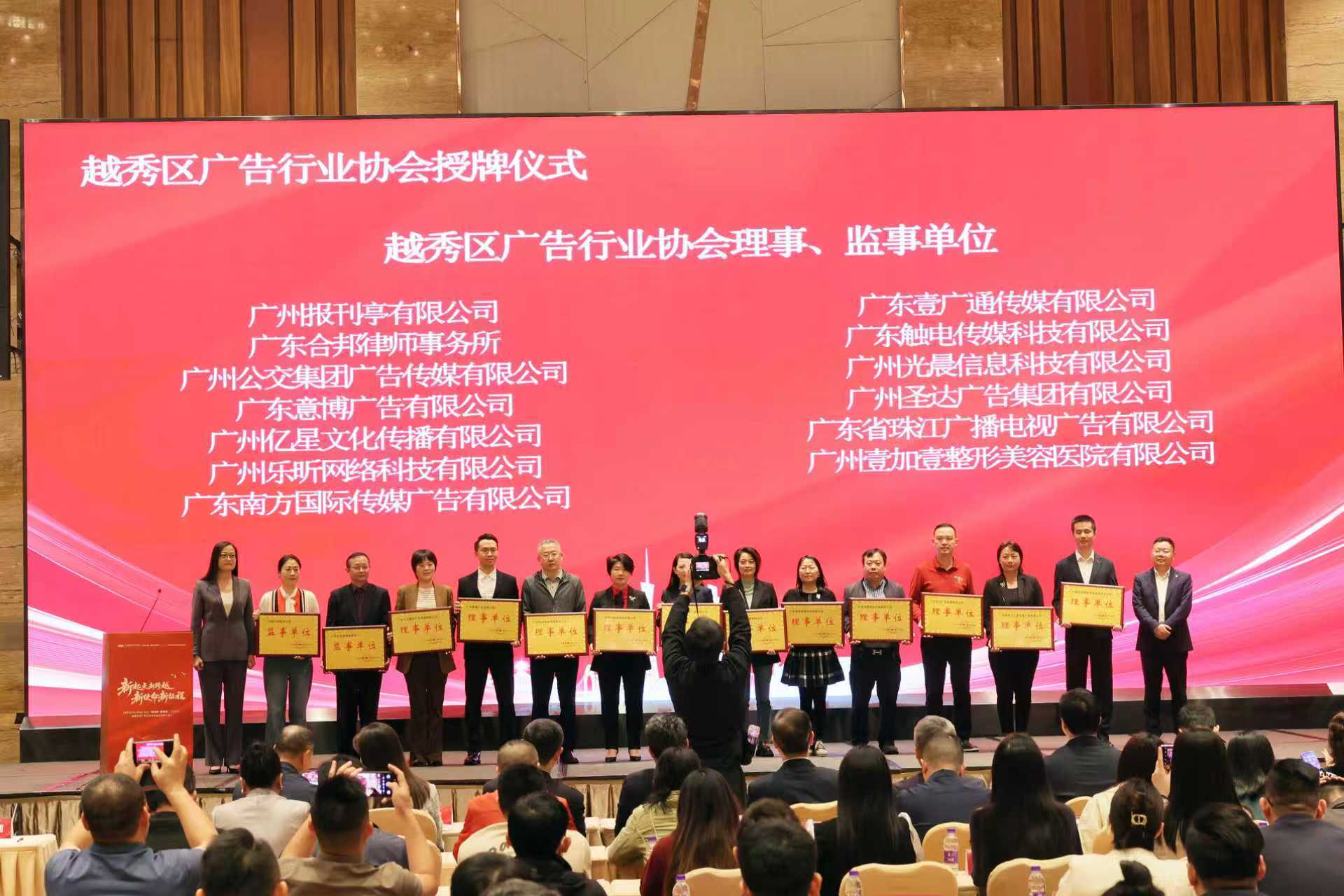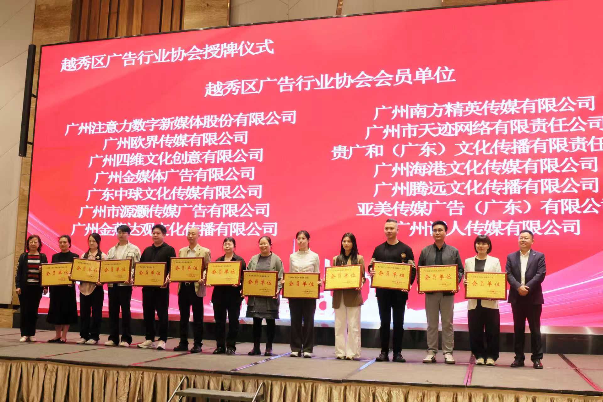 活动现场为9家发起单位、1家会长单位、4家副会长/监事长单位、13家理事/监事单位及27家会员单位逐一授牌。中国广告协会也同步发来贺词,肯定协会成立对推动区域广告业规范化、规模化发展的重要作用,希望区协会可以进一步凝聚越秀广告企业力量,强化行业自律、激发创新活力,深耕区域特色、链接行业资源,助力区内广告产业高质量发展。
