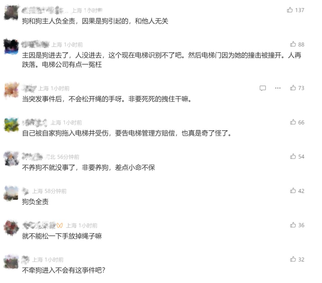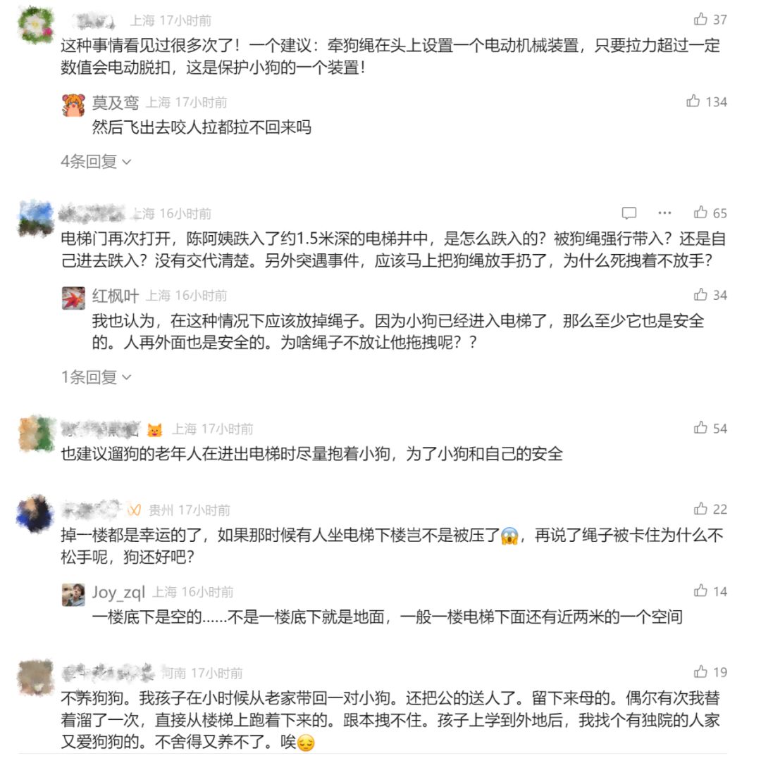 2024年4月的一天,陈阿姨和老伴遛狗回家乘梯,宠物狗先进入后,电梯门关闭,未进门的陈阿姨被狗绳拖拽至梯口,随后梯门再开,她跌入约1.5米深电梯井。
