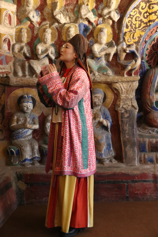 在精美的造像底下,汉服博主“悦风雅”忙着与精美的佛像合影。“我今天戴的是北魏的风帽,这个帽子能比较好地御寒、防风,从中也可以看出传统服饰也是讲究实用性的。”在上海工作的“悦风雅”本身便是一位传统服饰爱好者,她曾去过两次云冈石窟,尤其喜欢其中的第12窟。“它记录了北魏不同时期的造像、服饰,对于我们做服饰的研究,包括了解当时的民俗习惯是一个很好的参考。当时我去云冈石窟的时候,由于条件有限,人也多,没办法很细致地参观。今天穿着北魏服饰逛展,也算是实现了当时的一个小心愿。”