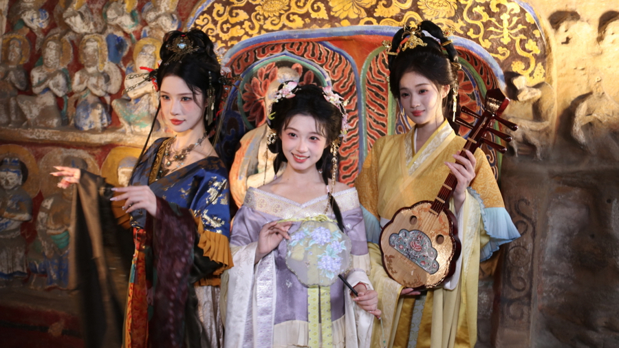 11月8日下午,多位汉服爱好者亮相云冈石窟艺术特展国风音乐季活动现场,在“第12窟”内进行流动巡演。当衣袂飘飘的身影穿梭于千年石窟的复刻空间,与壁上的“天宫乐伎”浮雕相映成趣,营造出“仙人如画,步入石窟”的梦幻场景。她们与观众即兴互动、合影留念,进一步增强现场的沉浸感与参与感。